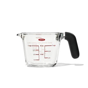We’ve made measuring, pouring, storing, heating and reheating liquids even easier with the OXO 1-Cup Glass Measuring Cup. Not only does it feature our bold, easy to read standard and metric measurement markings, the Cup is made of thermal shock resistant Borosilicate glass so you can take the Cup from the fridge or freezer straight to the oven or microwave without fear of it shattering. That means you can use it to reserve pasta water, heat butter or coconut oil, or reheat a batch of leftover stock or soup. The silicone non-slip handle adds an extra layer of comfort and control as it remains secure in the hand, even if it gets wet. Microwave-, fridge-, freezer- and dishwasher-safe.