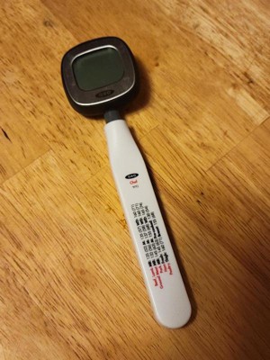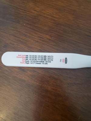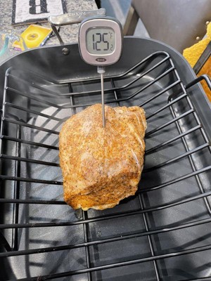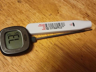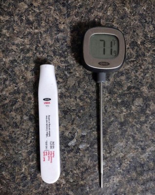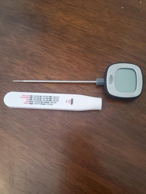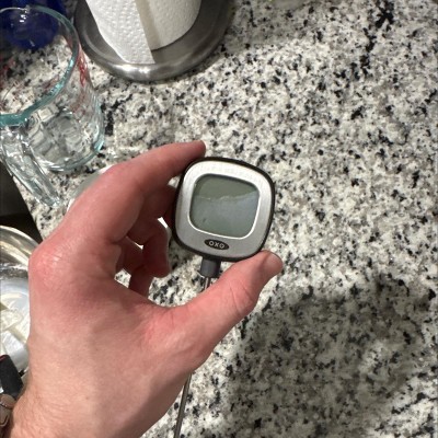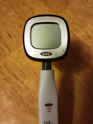 [This review was collected as part of a promotion.] This is a great digital thermometer, my fiancé busted my last one by leaving it outside so I was in need of something new. I’ve always loved the OXO brand so I gave this one a try, the display is large and easy to read and I’m easily able to turn it on and off after use. I like that the display swivels back on it as well, I’m able to poke a food and read it without feeling like I’m tiptoeing to see it. Another thing I really appreciate is the meat temps being on the case, I feel like I’m ALWAYS looking up proper temps and this just cuts that out completely.