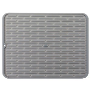 The OXO Silicone Drying Mat feature a unique rib design that aerates and elevates items, keeping them clean and sanitary. Mat can be rolled up or hung for storage. Heat resistant up to 425°F, so you can use as a trivet. Large enough to accommodate frying pans and platters.