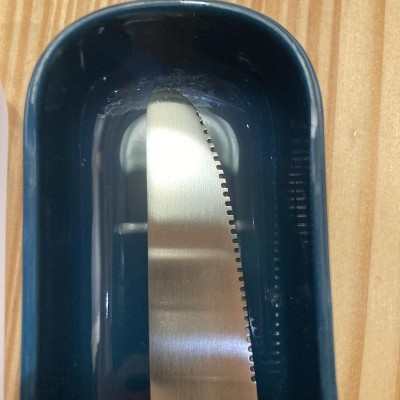Just received this and the utensils seem sturdy and feel nice in my hands. Unfortunately the knife was placed at the bottom and because it isn’t secured, it significantly scraped the inside of the case. There are blue plastic pieces all over the interior. Will be returning.