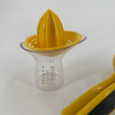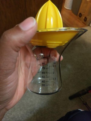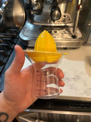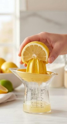 I've been looking for a reliable, easy-to-clean manual juicer for ages, and this design is fantastic. It's quickly become an indispensable tool for making everything from fresh lemonade to flavorful sauces and cocktails. The bright yellow reamer is perfectly shaped, effortlessly extracting every last drop of juice from lemons and limes without getting messy. It does an excellent job of filtering the pulp and seeds right away, leaving pure, clean juice collected in the base. It requires minimal effort, even when juicing a whole batch of fruit. The true genius of this product is the clear glass collection cup. It features clearly labeled, easy-to-read measurement markings in both cups and milliliters (up to 4 oz or 100 mL). This means I can juice exactly the amount I need for a recipe without having to dirty a separate measuring cup, which is a huge time-saver. The glass base also provides stability; it's heavy enough that it doesn't wobble or tip when you're pressing down hard on the fruit. Not only is it highly functional, but the two-piece design separates easily for thorough cleaning. If you do any amount of cooking, baking, or cocktail-making that requires fresh citrus, stop using clunky alternatives. This juicer is a compact, functional, and visually appealing addition to any countertop. Highly recommend!