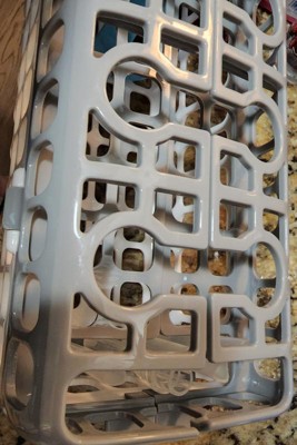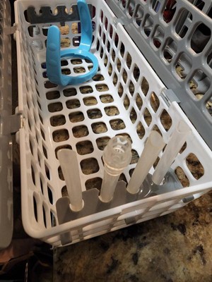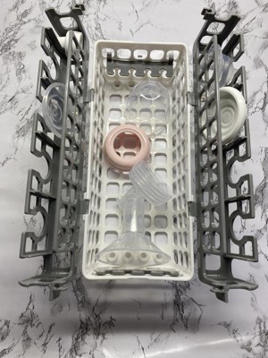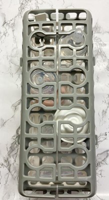 This basket has been a game changer. We use bottles with several parts. This basket makes washing everything in the dishwasher so easy. I don’t have time to hand wash bottles with a baby and toddler. We have two of these baskets and they hold up well. I will say it helps to separate bottle nipples from the tops to make sure everything is really clean. This basket can hold parts for up to 8 bottles, it can do tall or short bottles. This basket keeps everything organized and safe in the dishwasher.
