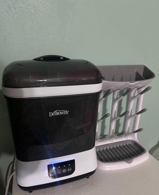 Works great with my babies bottles, doesn’t take much space on my counter and has lasted me a while. It’s easy to clean and designed in a way that catches the water when drying.
