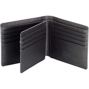 Measuring 4.25" x 3.25 when closed this men's wallet has 12 card slots plus an ID flap and can fit 15+ cards. It also includes a divided billfold to keep your money and receipts organized.