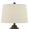 Brighten your decor with the designer style of this rustic table lamp by Regency Hill. The design features a vase-shaped base that has a hammered faux wood appearance. An oatmeal fabric shade on top adds to the fabulous style.