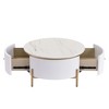 This modern round coffee table combines sleek design with practical storage, featuring a marble-patterned tabletop and golden legs for a sophisticated aesthetic.