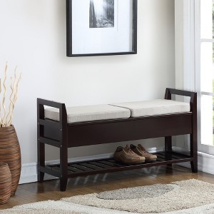 Product Name: CAVINAS 40" Shoe Rack, Modern Wooden Storage Bench with Open Shelf and Cushions, End of Bed Footrest for Living Room, Bedroom, Entryway, Espresso