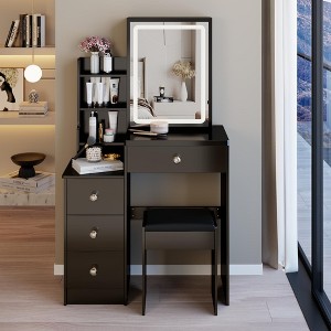 Product Name: PAGED Vanity Table Mirror with Lights and Table Set, 29.2" Large Left Bedside Cabinet Vanity Table and Cushioned Stool,Black