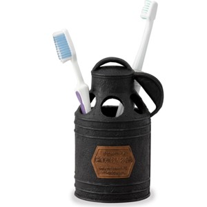 Decorate your counter space with a new bathroom accent accessory using this unique country charm. Features a farmhouse milk can in the form of a toothbrush holder with a versatile black and bronze finish. Provides a functional and stylish feature by offering numerous cutout compartments to hold various sizes of traditional and electric toothbrushes or other restroom items.
