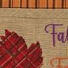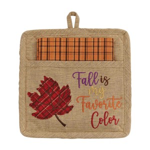 Conveniently store your fall textiles together with this colorful pocket oven mitt. The vibrant orange, purple, and red stitched leaf and quote design creates a pop of color against the beige background for the perfect seasonal kitchen accessory in a variety of home decor styles. Included in this set is a classic plaid dishtowel in an orange and brown pattern that will get softer and more absorbent with each and every use.