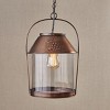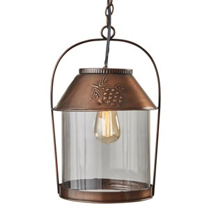 This rustic pendant light adds a farmhouse appeal to your interior space. Features shiny, embossed pinecone detailing in a copper finish for a versatile and stylish lighting accent to softly illuminate a kitchen, dining room or bedroom space. With 3 feet of adjustable chain combined by 7 feet of cording and a coordinating ceiling plate, this metal hanging light pendant can be easily hard wired to any desired ceiling. Pair this ceiling light with a 60 Watt bulb for full effect, not included.