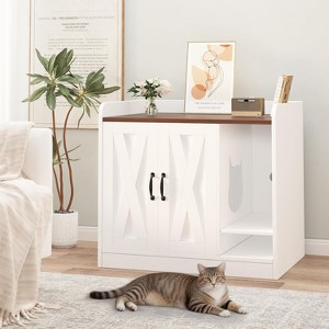Disguise your cat's litter box in style with this multi-functional furniture piece. Its spacious interior fits most litter boxes, while the stylish white design doubles as a side table or nightstand. Features double front doors for easy cleaning, a side cat entrance, and a built-in litter mat to reduce tracking. An elegant solution for any room.