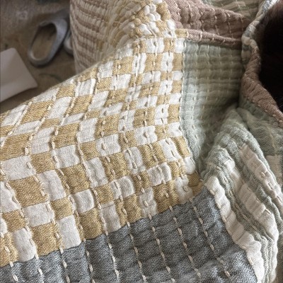[This review was collected as part of a promotion.] The Parachute 50×70 Throw is very soft and comfortable. It is made with 100% cotton. It's not really thick or really thin. It keeps you warm without causing you to get too warm, making it suitable for different temperatures. I love the patchwork design. The throw holds up very well to washing and drying.
