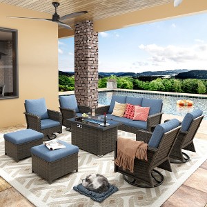 Patio Furniture Set 8 Peices with 44" Propane Gas Fire Pit Table, Outdoor Sectional Furniture Conversation Sofa Set with Cushion for Porch Backyard