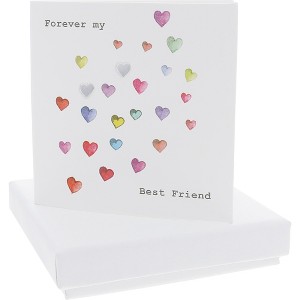 - IN-HOUSE DESIGN: The cheerful celebratory printed watercolored rainbow heart design with the earrings strategically placed within the other hearts. The typewritten style gray "Forever My Best Friend" sentiment is in the upper left and lower right.