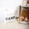 18" square pillow cover is a luxurious poly-cotton blend consisting of 70% polyester, 30% cotton, and a soft-touch 290 GSM. All surrounding edges have a .75" white polyester fringe. The backside center features a hidden white/clear zipper track with a silver metal pull for easy removal and cleaning. "Life Is Better At" sentiment is screen printed onto the front side of the case, whereas "Camp" is a velvet-finished applique sewn below. Machine wash cold on a gentle cycle with like colors or spot clean. Lay flat to dry. Packaged in a plastic polybag with a hangable cardboard header. This timeless design is ideal for a woodsy log cabin house, RV, a-frame, tent, and housewarming gifts. Encapsulating memories of hikes in the woods, sitting around the campfire, fishing, biking, and so much more are the best ways to commemorate fun camping times. Throw this pillow on the couch, bed, or entryway bench for the cutest welcoming touch.