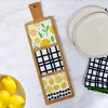 The Pavilion "Lemons" 3-Panel Ceramic & Bamboo Trivet is a delightful blend of function and style, perfect for protecting surfaces while adding a bright, cheerful accent to any kitchen. Measuring 16.5" x 5", this trivet features a sturdy bamboo frame that holds three ceramic tiles, each showcasing unique lemon-themed designs. One tile displays whole and sliced lemons with green leaves on a white background, while the others incorporate a classic blue checkered pattern and a polka-dot lemon design, creating a cohesive yet varied look. This vibrant, citrus-inspired trivet is an ideal gift for anyone with a love for lemon decor or yellow and blue color schemes in their kitchen. Its eye-catching design is perfect for summer gatherings or for adding a pop of color year-round. The high-quality materials ensure durability, with the heat-resistant ceramic tiles offering practical protection for your countertops and tabletops. Whether used as a decorative piece or as a functional trivet for hot dishes, it brings a fresh, summery vibe to the home. For longevity, handwashing is recommended to maintain the colors and patterns. Packaged in a clean, white die-cut box, this trivet is ready for gifting and makes a thoughtful present for housewarmings, birthdays, or special occasions. Pavilion’s collection includes a variety of coordinated serveware items, allowing you to create a cohesive kitchen aesthetic with ease.