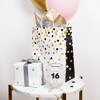 - IN-HOUSE DESIGN: The frontside features "Sweet 16" pink and metallic silver words on the upper front portion. The 12 sides have a glossy tan, metallic silver, muted shiny blue, purple, brown, and pink speckled pattern that wraps entirely around the 3/4 upper portion of the glass vessel.