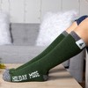 - IN-HOUSE DESIGN: The crew socks have a heathered gray ankle, toe & heel with a green heathered body and a cream "Holiday Mode" sentiment on the outer lateral of the boot socks. In addition, a sewn-in cream tag has a pine Christmas tree silhouette on the top of the sock. This design reflects on the exterior of each hose.
