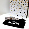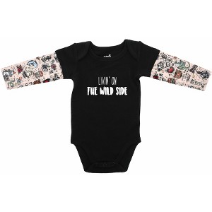 This black bodysuit is made from 100% cotton with metal trip snap bottom and fold-over shoulder flaps to easily slide front top to bottom or over the head. The sleeves are made from a combination of 95% polyester & 5% spandex mesh in a tan color. Fits size 6-12 months. Also available in 12-24 months. . The sleeves consist of new school-style inspired drawings, including puppies, pawprints, dice, hearts, stars, flowers, dragons, bottles, binkies, sailboats, waves, lighthouses, dolphins, tigers, birds, ladybugs, anchors, stars, snakes, polka dots, burgers, "Born To Be Wild," "Mom," "Spoiled," "I'll Take A Bottle Of House White," "Snack Monster," "Lucky," and more which all consist of the colors of the rainbow. The front chest center has a "Livin' On The Wild Side" sentiment. Machine wash cold on a gentle cycle with like colors. Lay flat to dry or tumble dry low. Packaged in a plastic polybag on a black plastic hanger with a hang tag.