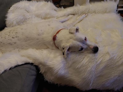 [This review was collected as part of a promotion.] We love the fluffy white blanket that Phoebe got from paw.com. Before we would not let her up on the couch and sit by us because she's white and she sheds and we don't want to get the couch dirty. Now we have her fluffy blanket that takes up a large area on the couch and when we put it down she knows she can get up there with us and watch TV! It's very durable and soft. We haven't washed it yet because we've only used it a few times but we love it and so does Phoebe.