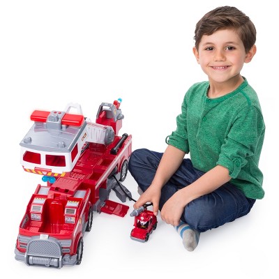 Put out fires and save the day with this Ultimate Rescue Fire Truck from Paw Patrol! The vehicle, with its adjustable 2 ft. ladder, flashing lights & sounds, it set for it all! Create play missions with the Marshall figure in the lookout cab, and lift the top open to help him jump into action. Send water cannons hurling into the fire with the 3 launchers at the bottom of the cab. The mini fire cart kept inside the fire truck can roll right into action whenever you want. For smaller missions, you have a small fire hose as well! Save baby animals in trouble with the claw arm and keep them safe.