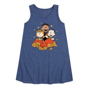 Peanuts - Peanuts Pumpkin Trio - Toddler & Youth Girls A-line Dress - From the best-loved comic strip in history comes officially licensed PEANUTS apparel for fans everywhere. Show your love for Charlie Brown, Snoopy, Woodstock, Lucy, Linus, Pigpen and the whole gang. Copyright Peanuts.