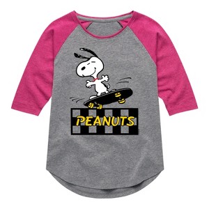 Girls' Peanuts Snoopy Skater Shirt Tail Raglan Graphic T-shirt - Athletic Heather/Fuchsia - 2T