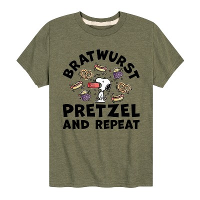 Peanuts - Bratwurst Pretzel And Repeat Snoopy - Toddler & Youth Girls Raglan Graphic T-Shirt - From the best-loved comic strip in history comes officially licensed PEANUTS apparel for fans everywhere. Show your love for Charlie Brown, Snoopy, Woodstock, Lucy, Linus, Pigpen and the whole gang. Copyright Peanuts.