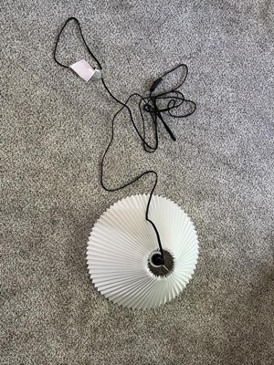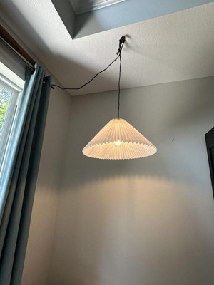 Bring a stylish update to your home lighting with the Pendant Lamp with Pleated Fabric Shade from Room Essentials™. This white pendant lamp features a fabric shade with a pleated design for a standout look you'll love adding to your space. Designed with a one-way light setting, it has an adjustable height to meet your lighting needs and is easy to operate with an inline (cord) rocker switch.