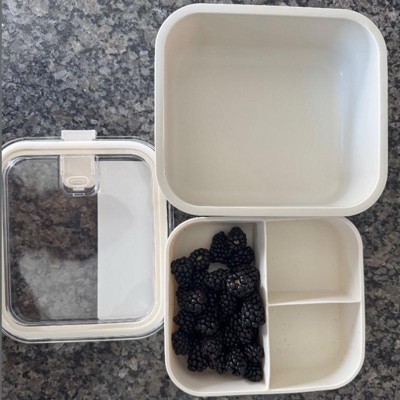 [This review was collected as part of a promotion.] I absolutely love the cream color of this personal snack box and it will be a great way to transport food to and from work. The top has a nice sliding vent for microwaving. I do think it would be a little more practical with more depth or space. The internal compartment takes up the majority of the space so I’m a little confused by the design.