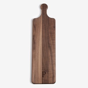 Elevate your serving experience with the Personalization Mall Heritage Initial Engraved Walnut Paddle Serving Board, a stunning blend of sophistication and functionality. Crafted from domestically sourced walnut wood, this serving board showcases a rich, natural grain that complements its timeless design. Personalized with any initial, the engraved detailing adds a bespoke touch, making it a perfect gift or a cherished addition to your kitchen. Measuring 6 inches wide, 21 inches long, and 0.75 inches thick, it offers ample space for arranging appetizers, charcuterie, or desserts. The natural wood knots and variations lend unique character to each piece, ensuring no two boards are exactly alike. Easy to care for, simply rinse with a warm, soapy cloth and preserve its beauty with mineral oil—avoiding dishwasher use for longevity. Proudly made in the USA, this board is a testament to exceptional craftsmanship and refined style, ready to enhance any gathering or occasion.