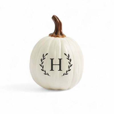 Introduce an elegant touch to your seasonal décor with the Personalization Mall Laurel Initial Monogram Pumpkins. These finely crafted resin pumpkins stand a stately 9 inches tall, complete with a 3.5-inch stem, providing an eye-catching centerpiece for your fall festivities. Each pumpkin showcases exquisite artistic detail, presenting a remarkable blend of realism and artistry. Make it truly yours by personalizing with your initial, encircled by a classic laurel design. Whether you're celebrating Halloween, Thanksgiving, or simply embracing the beauty of fall, these beautifully painted pumpkins offer a unique and sophisticated way to adorn your home. Sold separately, each allows you to create a personalized and cohesive aesthetic across your space.