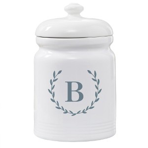 Elevate your kitchen decor while keeping your favorite treats fresh with the Personalization Mall Laurel Wreath Personalized Cookie Jar. This exquisite piece features a classic design with a customizable initial, adding a personal touch to your countertop. Crafted from high-quality, heavy-weight, chip-resistant stoneware, this jar is both durable and elegant. Its airtight lid and ribbed base detail ensure your cookies stay deliciously fresh. With a generous size of 10 1/2”H x 6 1/2” in diameter, it perfectly combines functionality and style. Dishwasher safe, with a permanent printed design, this cookie jar is a timeless addition to any home.