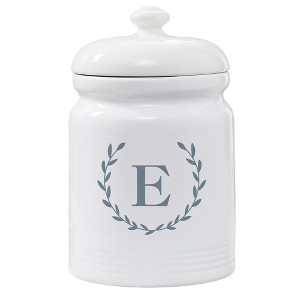 Elevate your kitchen decor while keeping your favorite treats fresh with the Personalization Mall Laurel Wreath Personalized Cookie Jar. This exquisite piece features a classic design with a customizable initial, adding a personal touch to your countertop. Crafted from high-quality, heavy-weight, chip-resistant stoneware, this jar is both durable and elegant. Its airtight lid and ribbed base detail ensure your cookies stay deliciously fresh. With a generous size of 10 1/2”H x 6 1/2” in diameter, it perfectly combines functionality and style. Dishwasher safe, with a permanent printed design, this cookie jar is a timeless addition to any home.
