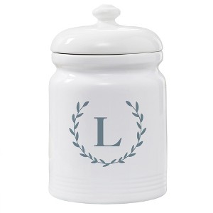 Elevate your kitchen decor while keeping your favorite treats fresh with the Personalization Mall Laurel Wreath Personalized Cookie Jar. This exquisite piece features a classic design with a customizable initial, adding a personal touch to your countertop. Crafted from high-quality, heavy-weight, chip-resistant stoneware, this jar is both durable and elegant. Its airtight lid and ribbed base detail ensure your cookies stay deliciously fresh. With a generous size of 10 1/2”H x 6 1/2” in diameter, it perfectly combines functionality and style. Dishwasher safe, with a permanent printed design, this cookie jar is a timeless addition to any home.