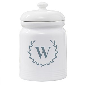 Elevate your kitchen decor while keeping your favorite treats fresh with the Personalization Mall Laurel Wreath Personalized Cookie Jar. This exquisite piece features a classic design with a customizable initial, adding a personal touch to your countertop. Crafted from high-quality, heavy-weight, chip-resistant stoneware, this jar is both durable and elegant. Its airtight lid and ribbed base detail ensure your cookies stay deliciously fresh. With a generous size of 10 1/2”H x 6 1/2” in diameter, it perfectly combines functionality and style. Dishwasher safe, with a permanent printed design, this cookie jar is a timeless addition to any home.