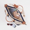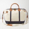 - Made from 100% heavy cotton canvas with navy and leather accents and claw clasps at sides