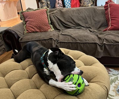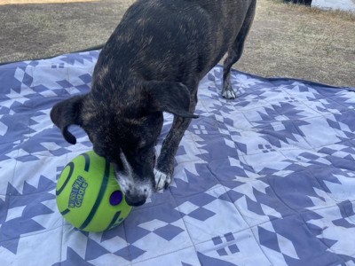 Energetic lab puppy actually plays to the point of needing to nap after! PLUS, it’s small enough for him to carry but too big for him to chew so it’s unscathed through all the play time!