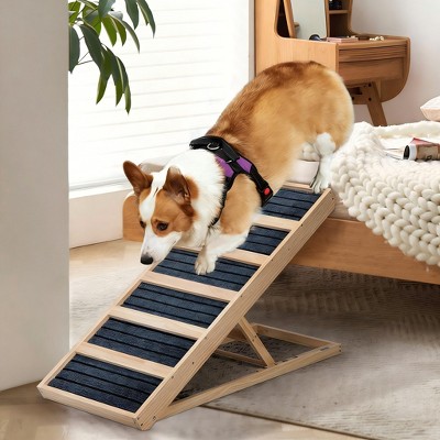 This item would be so much better if the carpet allowed for grip and it was a bit wider. My senior American Bulldog kept sliding down the carpet and falling off on either side because his body was too wide to walk up it.