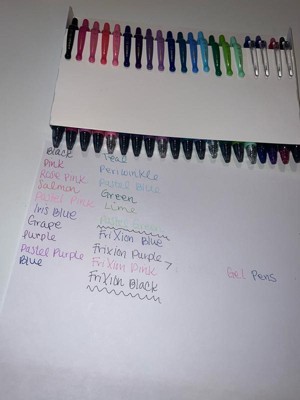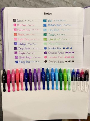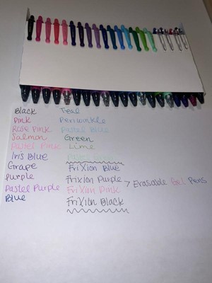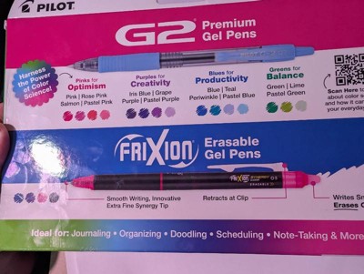 - Includes: 16 G2 Fine Point (0.7mm) Gel Pens in Black, Pink, Rose Pink, Salmon, Pastel Pink, Iris Blue, Grape, Purple, Pastel Purple, Blue, Teal, Periwinkle, Pastel Blue, Green, Lime, and Pastel Green; 4 FriXion Synergy Extra Fine Point (0.5mm) Erasable Gel Pens in Blue, Purple, Pink, and Black.
