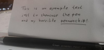 [This review was collected as part of a promotion.] This is a fine pen. The ink for all the pens in the pack are a little lighter in color than other pens I use. I also wasn’t a fan of the clicker being on the side of the pen and being plastic. Seems very prone to breaking and since that’s how you click your pen that’s not a good design element. The pen feels lightweight, but not necessarily cheap. I like the idea of it being a erasable and I did try that out with some success. I don’t think that’s a feature. I will be using very often though. In general it wrote fine, certainly visible and rolled fairly smooth.