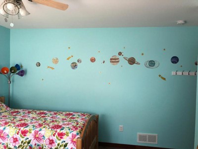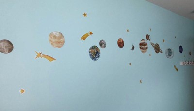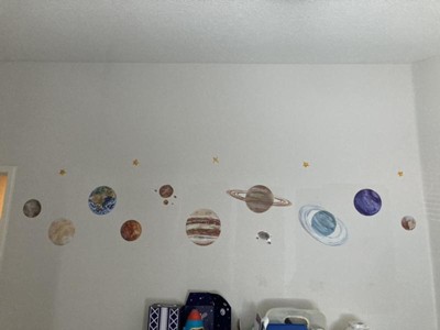 Bring the vastness of outer space into your home or school with RoomMates Watercolor Planets peel and stick giant wall decals. The mysteries of the planets and deep space, artistically rendered in imaginative watercolor effect, transforms rooms into a journey into the solar system. Mars, Saturn, Jupiter, and Earth, to name a few, create timeless de cor for young astronomers in education stations, bedrooms or playrooms. RoomMates wall decals are an easy and affordable way to decorate in minutes. Reposition or remove them effortlessly with no remaining sticky residue or damage to walls.