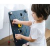 The PlanToys Wall Ball Game requires advanced concentration and strategic thinking! Use the pullies on the left and right sides of the board to move the yellow ball to the top without letting it drops. Children can create difficulty levels by creating obstacles with rubber bands or drawing in hurdles and monsters that they must avoid with chalk on the chalk-friendly surface. The center hole can be either an easy finish line or an obstacle at the advanced level. When finished playing, store the pieces in the provided wooden platform.