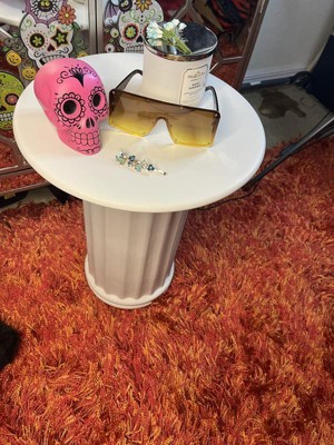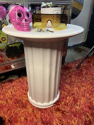 We love this contemporary plaster accent table. Table is well made and arrived in great condition. Base is pretty wide so I don’t have the fear of it being tipped over. We set it next to the couch in our living room and put our remotes on it but I think it would look nice with a plant on top.