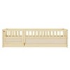 This twin-size floor bed offers a secure and imaginative space for children to sleep, read, or play. Crafted from high-quality pine wood, it features a surrounding high fence structure that enhances safety and provides a cozy private area. The integrated frame design ensures stability and durability, while the clockwise door opening allows for easy and safe access. The solid fixed construction is ideal for children’s bedrooms, supporting peaceful rest and active play. Delivered in a single box with all tools and instructions, this bed is easy to assemble. With a natural wood tone and minimalistic form, it complements various decor styles while prioritizing safety and functionality.