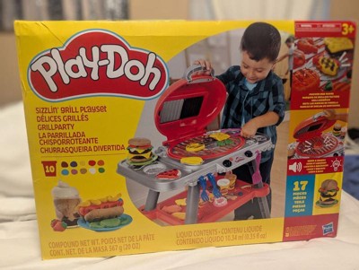 Fire up kids' imaginations with the Play-Doh Sizzlin' Grill Playset! This Play-Doh kit inspires kids BBQ pretend play with glowing lights, sizzling sounds, and a stamp pad that adds pretend grill marks onto Play-Doh foods. Just make a fake food creation, place it on the grill, close the lid, then open it again to reveal that realistic charred look. There are so many things they can make with 17 Play-Doh accessories including stampers, pretend burger and hot dog buns, a spatula, tongs, and more. 10 Play-Doh cans bring a great variety of colors to spark their imaginations. Kids cooking toys like this indoor playset can be BBQ-tastic holiday and birthday gifts for boys and girls 3 years and up. PLAY-DOH and HASBRO and all related trademarks and logos are trademarks of Hasbro, Inc.