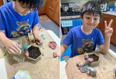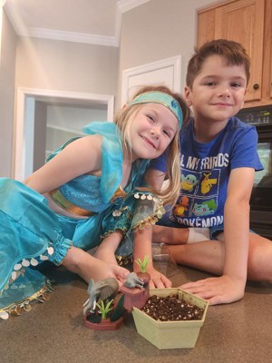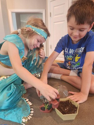 The play kit was fun for the kids to make. You will need your own soil and some type of shovel. It sprouted very quickly and we didn’t even water, just used the cover. Kids enjoyed planting as well as playing with the scene during set up. The little elephants are nice because they can be used as toys after the excitement of planting passes.