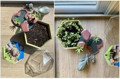 My boys and I love this little planting kit, complete with all components to easily grow an herb/plant. It includes a small hexagonal planter (made of recycled plastic), a hexagonal dome to cover the planter to keep the seeds warm and encourage seed germination and plant growth, and nature scene components (i.e., a rock, a waterfall, watering hole, 2 shrubs and 2 elephants, made of recycled plastic) to make the completed project visually appealing. My sons took turns assembling the kit for the project (from pouring potting soil into the planter, moistening it, scattering the mustard seeds, and putting the nature scene pieces together). It was a fun sensory/science project that they were able to work on together. We had fun putting this together and were all excited to see the seeds sprout and grow to a good height in a matter of just 4 days! This is a great kit to introduce younger kids to planting and growing their own herbs in a simple and fun way and definitely a learning opportunity for them. The kit comes with simple instructions (easy to implement) with some fun science facts. I highly recommend!