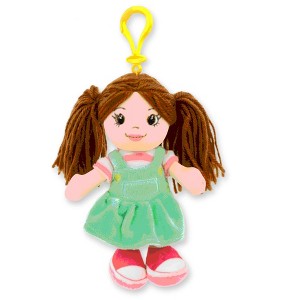 Ready for excitement, and adventure, let Allie become your child's new best friend. Our 6-Inch Allie Backpack Clip is the perfect size for small hands and features beautiful brown hair and brown eyes. Her embroidered facial features make this doll safe for your little ones, with no small parts coming loose. Allie comes dressed in an adorable mint green overall dress with embroidered buttons, a white and pink striped top, white socks, and pretty pink shoes. As soft as she is cute, she is ready to clip on and join in on the fun wherever your little one may go. With a wide cast of exclusive characters available from Playtime by Eimmie and Sharewood Forest Friends, our goal is to inspire your children to develop their imagination and cultivate their creativity with play. Clothing is not removable. Spot clean only.* Plush is 6 inches tall with a 2-inch plastic clip* Features embroidered nose, mouth, and eyes * Conveniently sized to bring along anywhere they go* 13 styles to choose from or collect them all* Great for imaginative play at home or away* Inspiring minds with toys that empower imagination